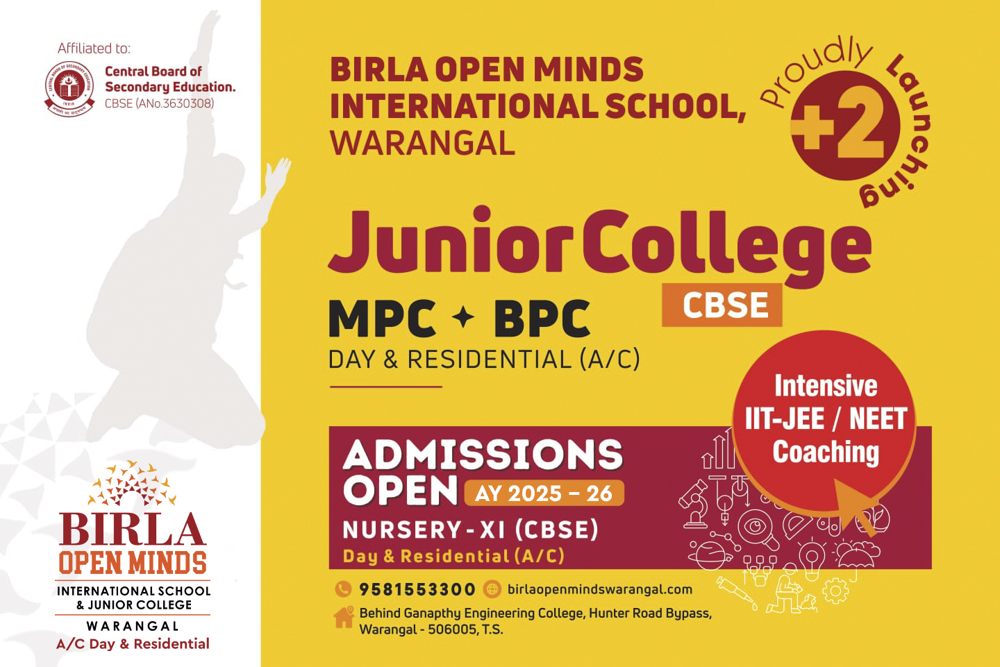 Welcome to Birla Open Minds International School, Warangal (BOMIS) — the best international school in Warangal and Hanamkonda, and a vibrant community of dedicated educators and high-achieving students. At BOMIS, we are committed to challenging and inspiring your children to develop a lifelong love for learning and empowering them to lead successful lives.